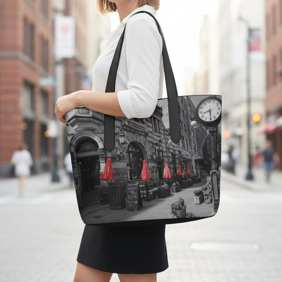 Pack your day with style! This vegan leather tote features "1910," a captivating photograph taken in Victoria, BC by Rob and Karen Photography. The textured pebble leather is built tough, inner pockets keep you organized, and it's light enough to carry anywhere. Art meets everyday practicality.